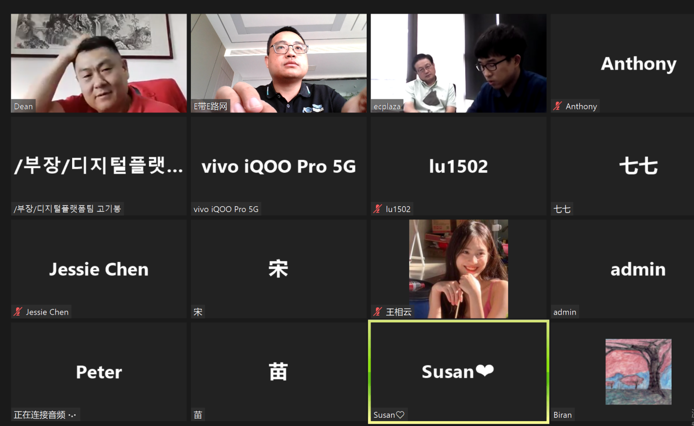 北京时间下午3点(韩国时间下午4点)活动正式开始,首先由我协会会长郁万玲郁会长致欢迎词,对现场出席Inkyu Park社长以及Sangseop Hong电商事业部部长以及NSV CO.,LTD的采购部经理 JAEJUNE LEE,PUNGKANG CO., LTD.的采购部负责人Jae Yun,MK Tower Co.,Ltd.采购部经理Jun Yong Eom, Serim Mulsan Co, Ltd采购部负责人TAE-KYUNG GO,Hana International Co.,Ltd.采购部主管Neil Lee,DONG KWANG SA WOO ceo-Hyeong Rok Song等韩方采购商代表以及ECplaza的金融事业部、B2B事业部的几位领导以及30多位企业们表示热烈的欢迎。