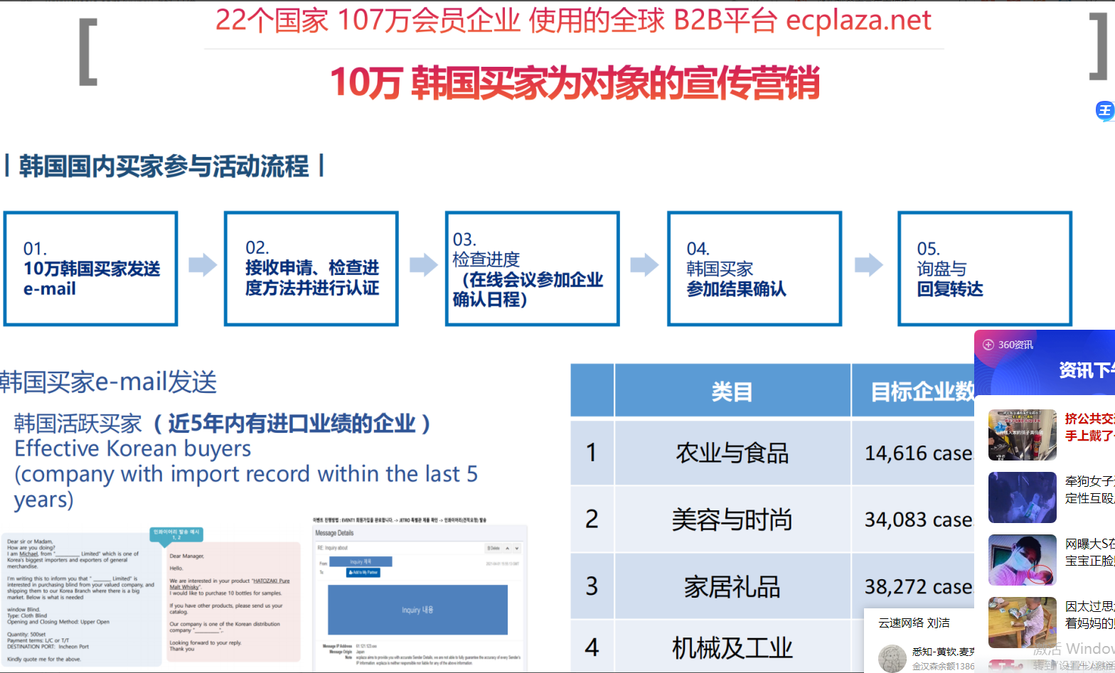 部长又介绍了平台跨境收款的平台信息,极大的便利了线上交易以及资金转化的实效性,降低了结汇成本。介绍了 JAEJUNE LEE,PUNGKANG CO., LTD、Hana International Co.,Ltd 、Serim Mulsan Co, Ltd、DONG KWANG SA WOO等12个优质韩国会员企业的采购负责人给我们的企业认识,介绍了提出了欢迎chinaebr.com 的会员企业入住Ecplaza平台,也希望能来中国临沂与大家见面。
