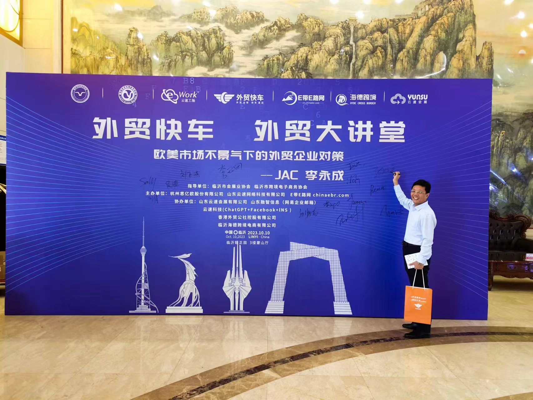 2023年10月10日“外贸快车大讲堂-欧美市场不景气下的外贸企业对策”活动在临沂颐正园大饭店举行。本次活动邀请 外贸快车北方大区渠道总监杨永军先生、临沂市贸促会国际贸易采购服务中心副主任王海波先生、临沂市会展业协会监事长公维科先生、临沂市会展业协会副会长兼秘书长赵庆利先生、临沂市跨境电商协会会长单位傅海滨先生等出席,会议吸引了近400家企业到场,会议现场气氛热烈,各企业家均表示获益良好.