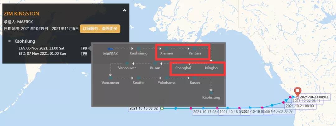 据大船期数据显示,除 ZIM 外,此次共舱船司众多,有 ALIANÇA、GOLD STAR LINE、HAMBURG SÜD、MAERSK、MCC,挂靠 盐田、宁波、上海、厦门等多个国内港口。