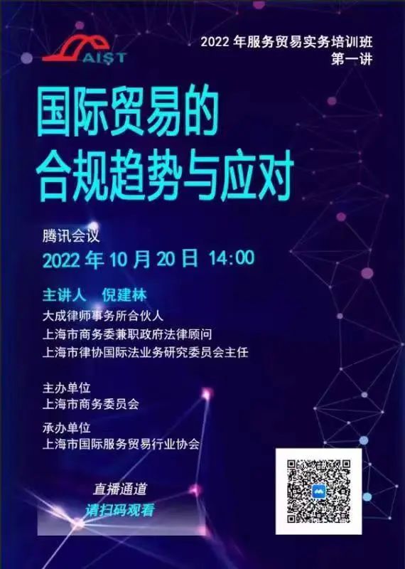 10月20日,由大成律师事务所倪建林老师从经贸规则,新态势,技贸措施影响等角度阐述《国际贸易的合规趋势与应对》,同时分析国际贸易规则的发展趋势,以及给我国技术性贸易措施工作带来的影响,并提出应对建议。