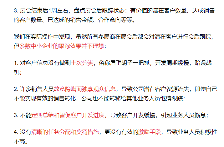 4月1日,由JAC老师为大家分享《展会客户离开摊位必做的几件事》活动专题培训,给大家分享展会结束后如何跟进客户,对于不同的客户,业务员应如何采取不同的策略进行跟进。