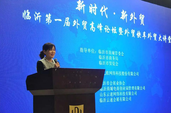 临沂商城管委会副主任刘海静女士为此次高峰论坛暨外贸快车外贸大讲堂活动致辞。刘主任指出临沂一直有“两张著名的名片”,一张“软名片”是“沂蒙精神”;另一张“硬名片”就是临沂商城。临沂人民继承发扬先辈的沂蒙精神,坚信“没有跑不了的路、没有吃不了的苦、没有干不成的事”,大力发展商贸市场,在各项基础条件并不优厚的情况下,走出了一条以商贸业为龙头带动区域经济社会全面发展之路,由“四塞之固,舟车不通;土货不出,外货不入”的闭塞之地,蜕变成闻名全国的“中国物流之都”、“中国市场名城”,形成了“南有义乌、北有临沂”的中国批发市场大格局。