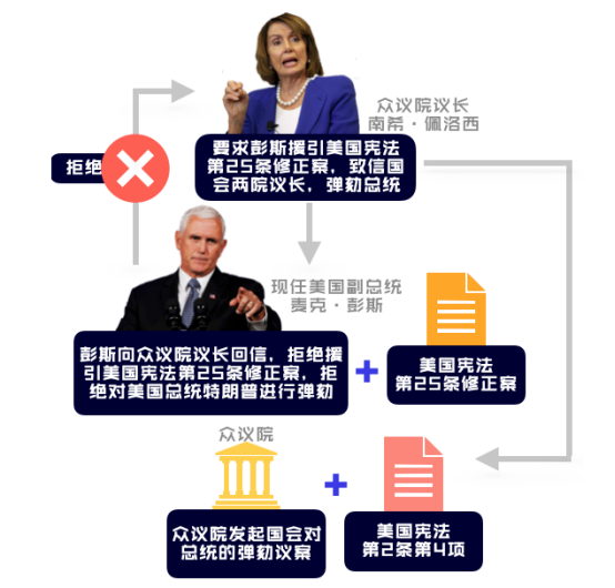在罢免和弹劾两个选择间,彭斯若不选择罢免,众议院就将选择弹劾。根据美国宪法第2条第4项,国会如果认定总统等官员在任期结束前“有叛国、贿赂或其他重大罪行和不检行为”,可以弹劾罢免。