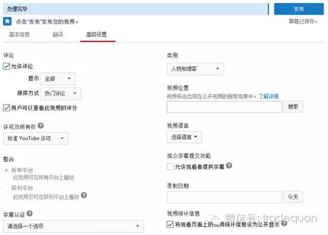 上传后可以对视频的标题、说明等进行设置,对于我们来说,这就要在这里做好长尾关键字,便于让google快速收录。所以都设置好后就可以点击上方的“发布”按钮进行发布了。